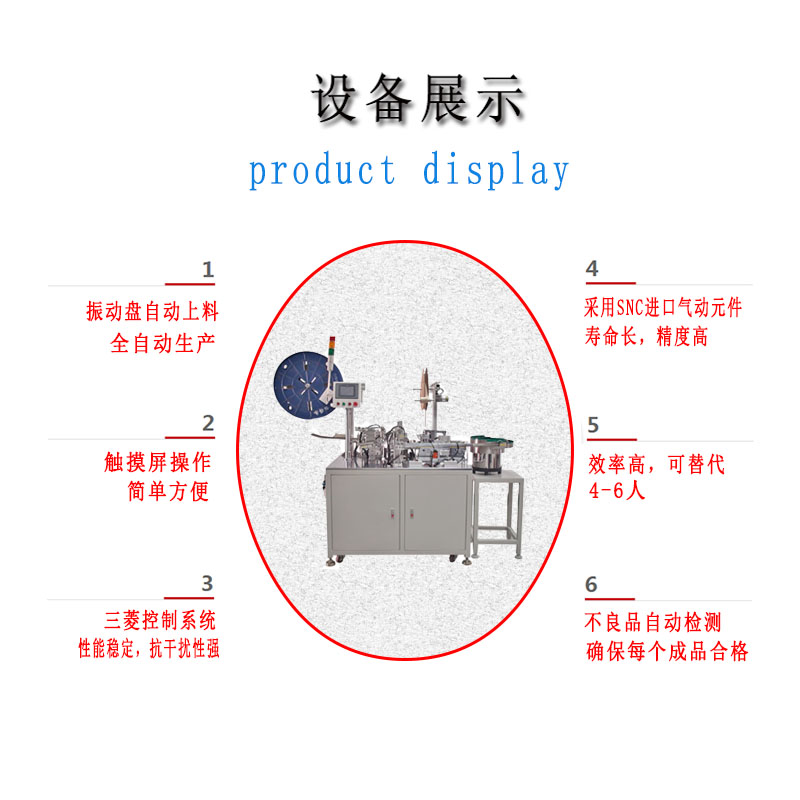 4:人工隻需(xū)補(bǔ)充物料,設備自動依次完成各(gè)工序組裝,並自(zì)動下(xià)料